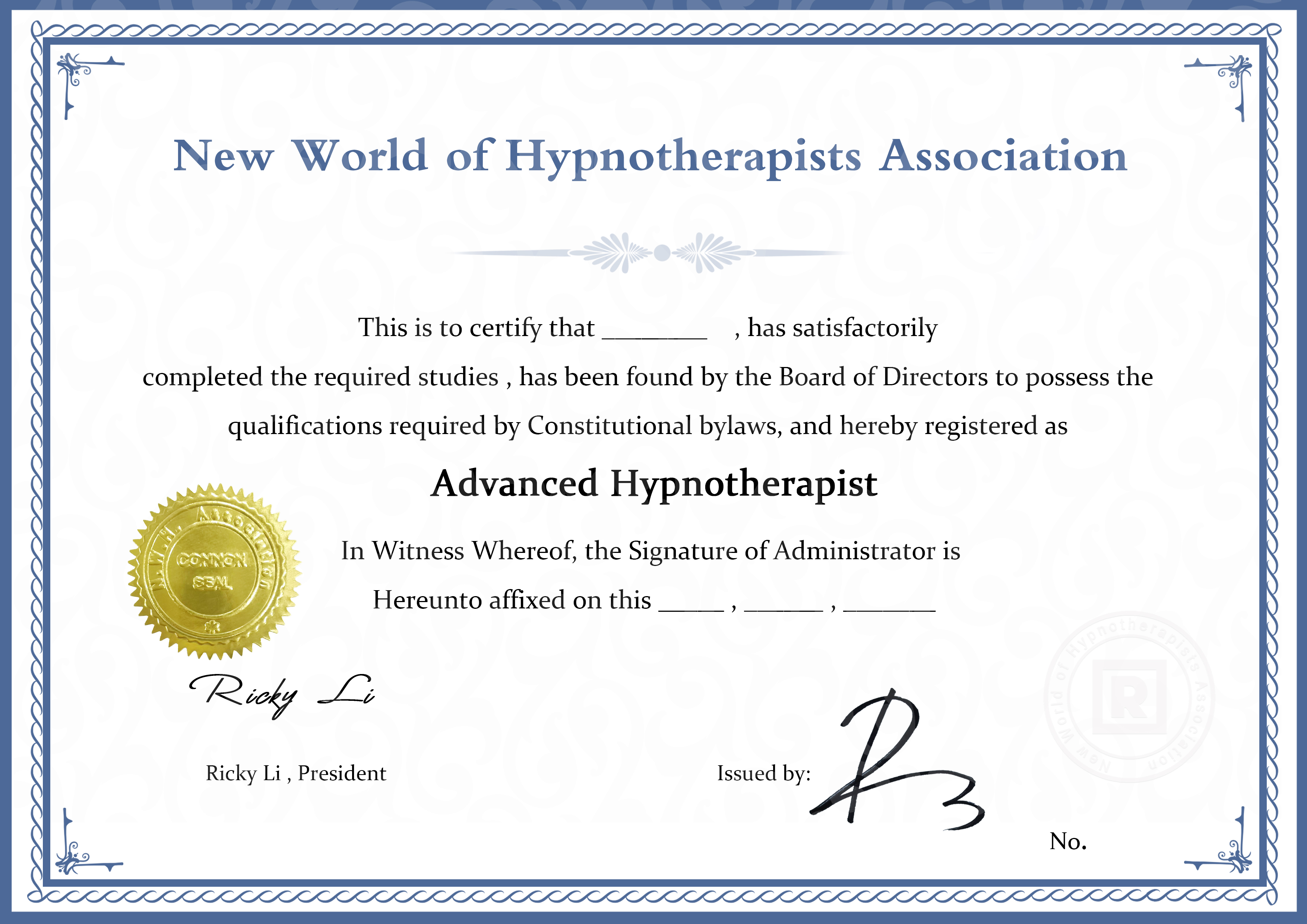 通过考核,颁发【美国NWH高级催眠疗愈师证书】